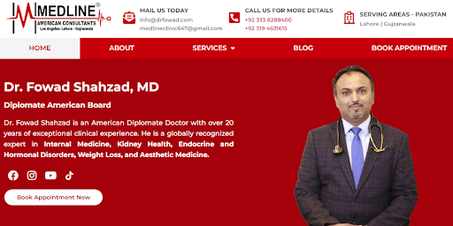 Dr. Fowad Shehzad at Medline Clinic Gujranwala is providing weight loss services with over 20 years of clinical experience. He has gathered experience from working at different hospitals and is an acknowledged expert in Gujranwala. His weight loss approach particularly focuses on weight loss diet plans and weight loss injections. He also recommends specialized drips for metabolism enhancement, ultimately resulting in weight loss.